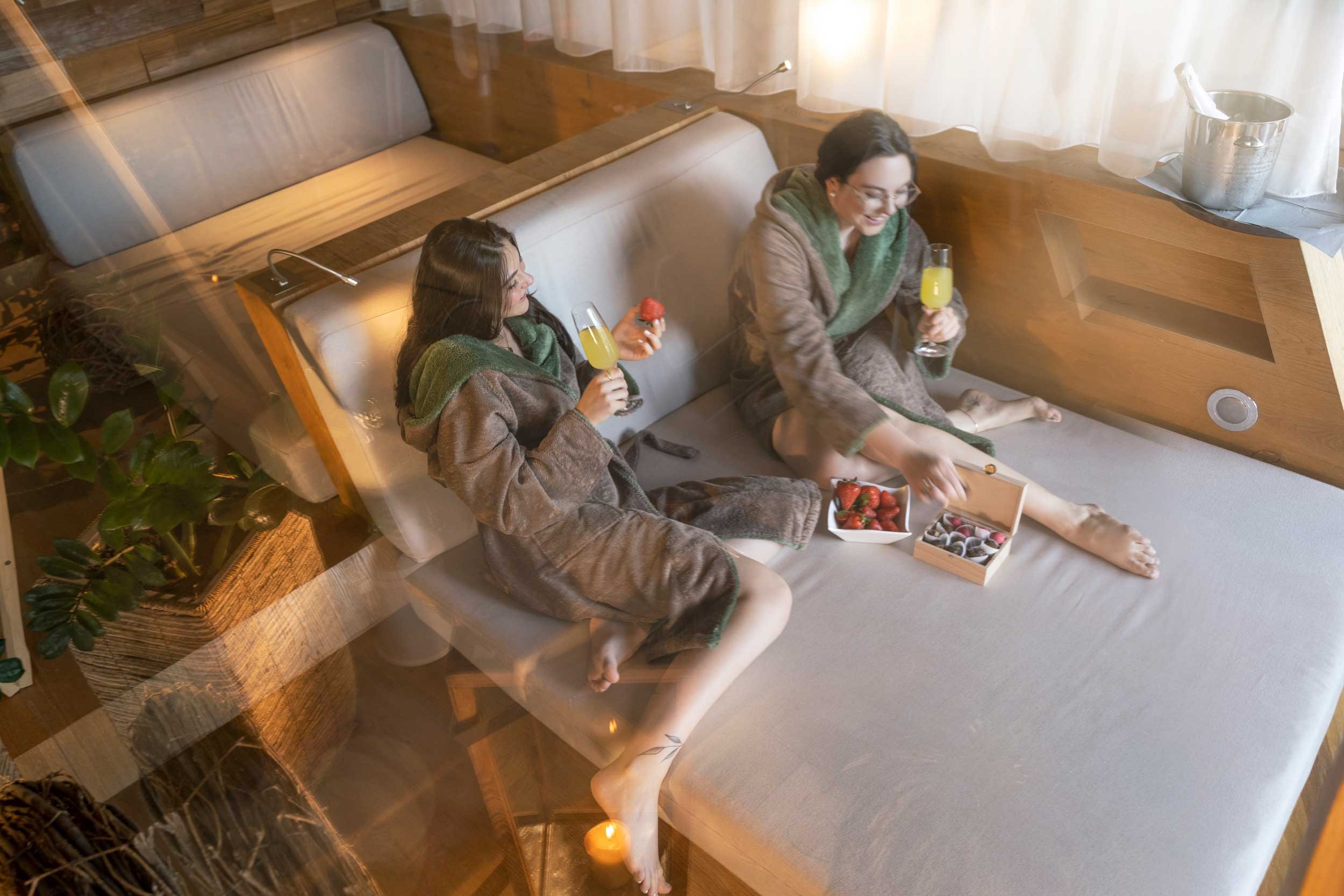 Als uns die Franziska an der Rezeption unsere Spa-Suite zeigte, war Katharina außer sich vor Freude. Überall warmes Holz, ein riesiges Sofa, eine freistehende Badewanne und das Allerbeste: Eine eigene Sauna im Zimmer! Wir packten gleich aus, warfen uns in Bikini und Bademantel, schalteten die Sauna ein. Inzwischen ließen wir uns auf dem Sofa nieder und plauderten und plauderten. Kinder, Mann, Job, Dates, Neuigkeiten… es gab einiges zu erzählen. Gegenseitig brachten wir uns auf den neuesten Stand, was unsere Baustellen namens Leben betraf. Fast hätten wir die Sauna vergessen! Wir genossen das Schwitzbad, bevor wir uns für das Abendessen stylten. Im Restaurant, fünf Gänge später waren wir satt, glücklich und zufrieden. Nach einem Absacker in der Hotelbar fielen wir müde in unsere Betten, unterhielten uns aber noch so lange, bis auch das letzte Auge zufiel.